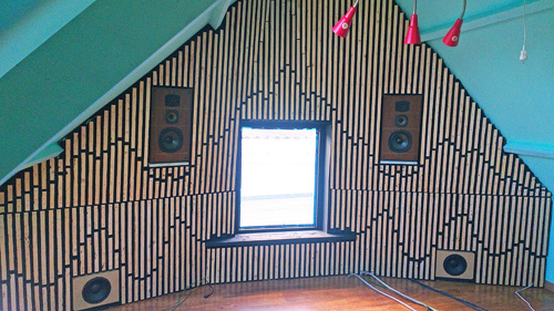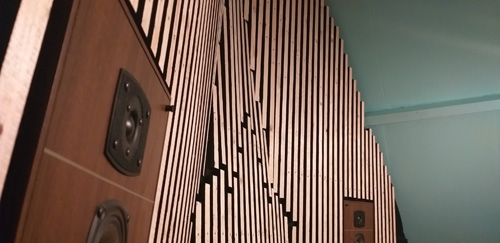Het main speakers systeem is ín de wand geplaatst, zodat er, in combinatie met het schuine dak, geen onplezierige reflecties ontstaan bij het